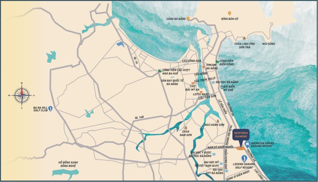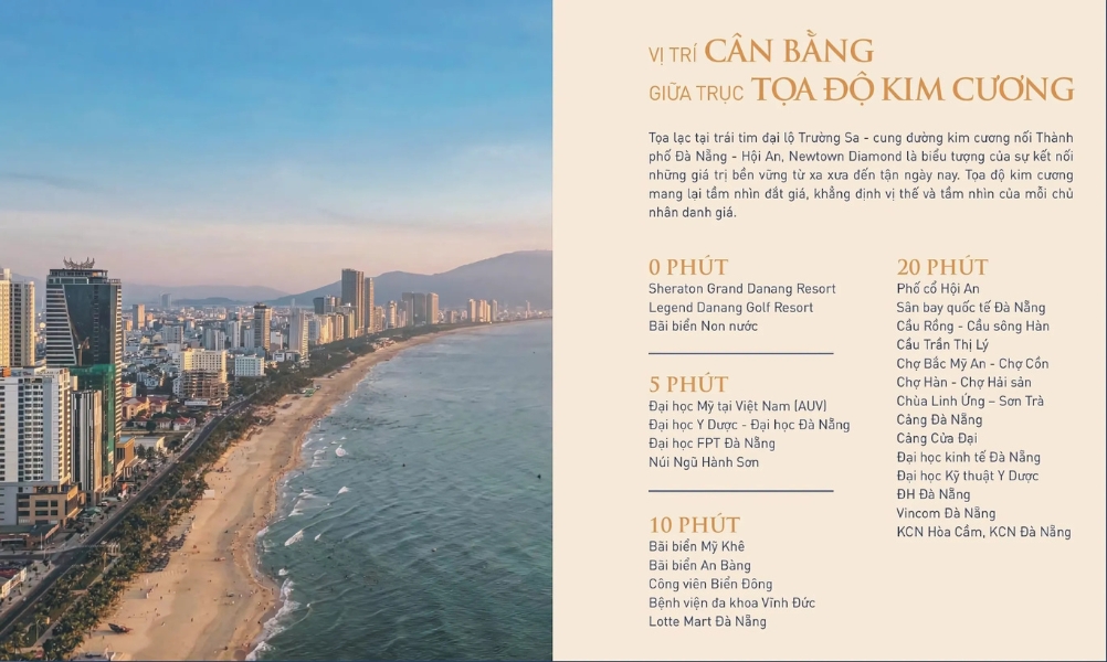 Dự án NewTown Diamond tọa lạc tại tâm điểm kết nối, nút giao giữa hai đại lộ Trường Sa và Nam Kỳ Khởi Nghĩa, cũng là cung đường huyết mạch nối hai trung tâm du lịch Đà Nẵng và Hội An. Nơi đây được mệnh danh là thiên đường nghỉ dưỡng với top bãi biển đẹp nhất hành tinh, nơi quy tụ hệ sinh thái sân golf và resort đẳng cấp 4-5 sao quốc tế.